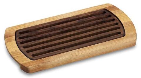 Pros: the inclined angle keeps the loaf of bread in place while you’re cutting, and the cutting grooves go beyond the bottom of the loaf making it easy to cut slices all the way through